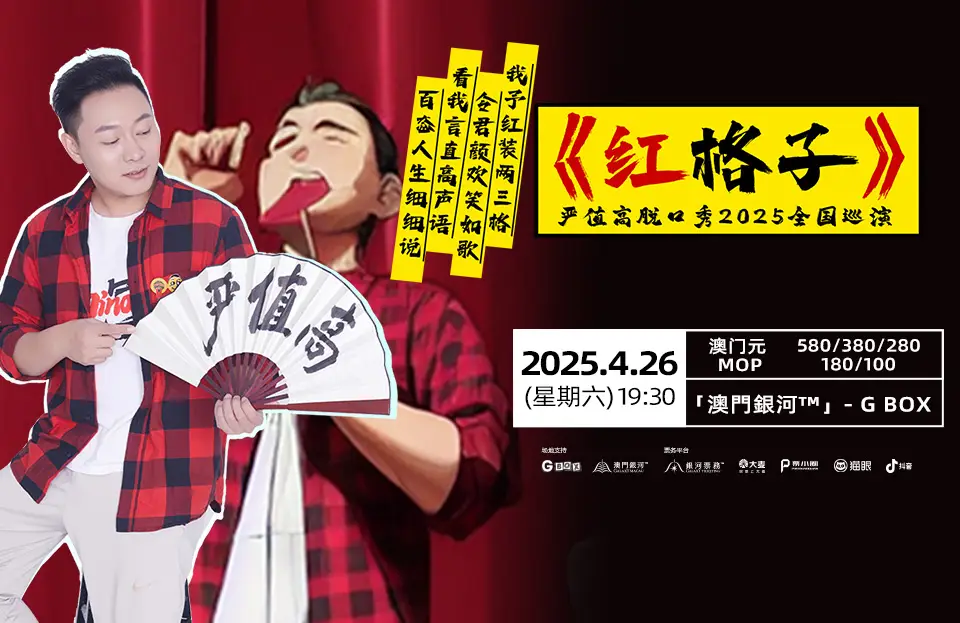 日期 04 月 26 2025 - 04 月 26 2025 已結束! 時間 19:30 嚴值高《紅格子》喜劇專場全國巡演澳門站 4月26日「澳門銀河」,嚴值高《紅格子》喜劇專場全國巡演,爆笑開演! 30秒一笑點,全場爆笑不停!現場即興互動,回懟台下神評論,共鳴梗滿滿。 9年千場演出經驗,釋放你的所有壓力! 活動: 嚴值高《紅格子》喜劇專場全國巡演澳門站 活動日期: 2025年4月26日(星期六) 活動時間: 晚上7時30分 場地: G Box 公開發售: 2025年3月25日(星期二) 門票價格: 港幣HKD/澳門幣MOP $580/$380/$280/$180/$100 座位表: 查看座位表 購票平台: 銀河票務 大麥 貓眼 餐飲優惠: 憑門票可尊享「澳門銀河TM」及「澳門百老匯TM」專屬餐飲優惠低至85折。 瞭解詳情! 分享這個活動 + Add to Google Calendar + iCal / Outlook export 活動地點 明珠大堂1樓1003 標籤 收費