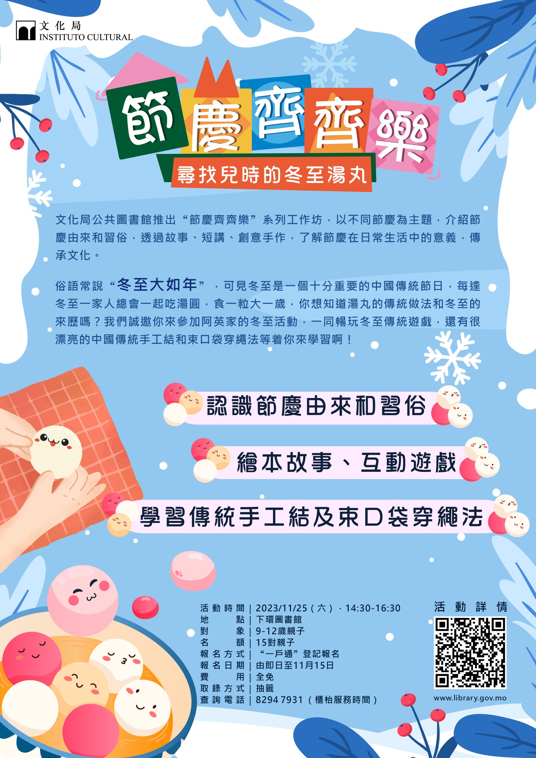 文化局公共圖書館推出“節慶齊齊樂”系列工作坊,以不同節慶為主題,介紹節慶由來和習俗,透過故事、短講、創意手作,了解節慶在日常生活中的意義,傳承文化。