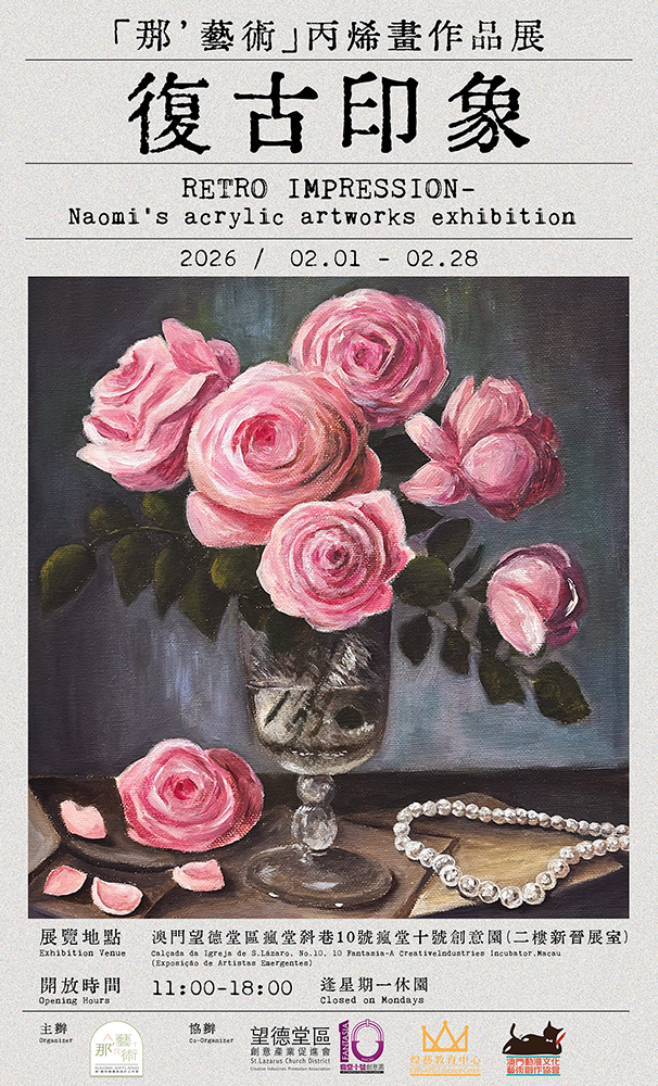 由那’藝術繪畫與設計工作室主辦,望德堂區創意產業促進會、瘋堂十號創意園、澳門煌藝教育中心及澳門動漫文化藝術創作協會協辦的《復古印象》——「那’藝術」丙烯畫作品展,將於2026年2月7日(星期六)下午3時正假澳門望德堂區瘋堂斜巷10號—瘋堂十號創意園花園舉行開幕式。