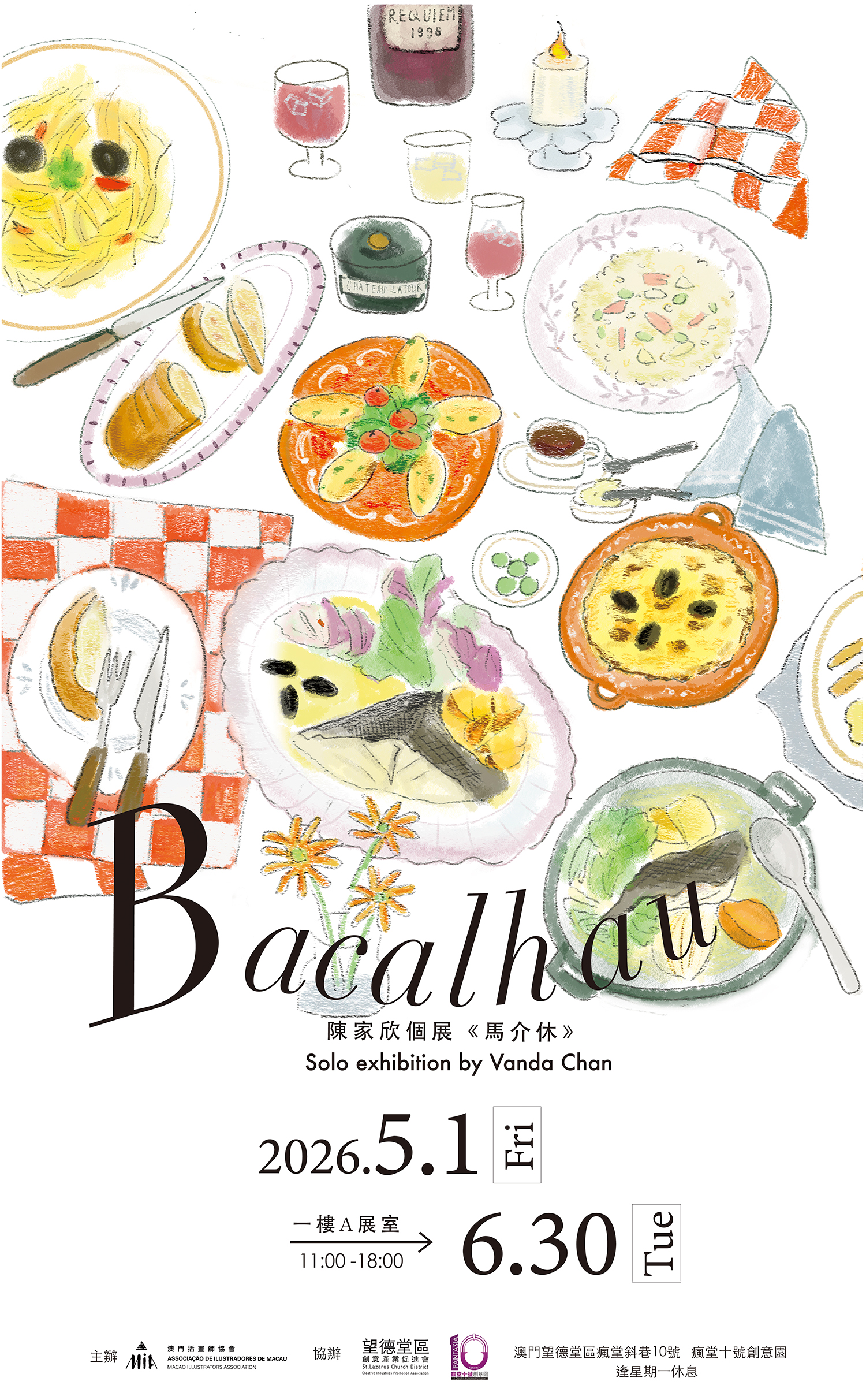 由澳門插畫師協會主辦,望德堂區創意產業促進會及瘋堂十號創意園協辦的《馬介休 Bacalhau》陳家欣個人作品展,將於2026年5月1日至6月30日在澳門望德堂區瘋堂斜巷10 號─瘋堂十號創意園1樓A 展室展出。