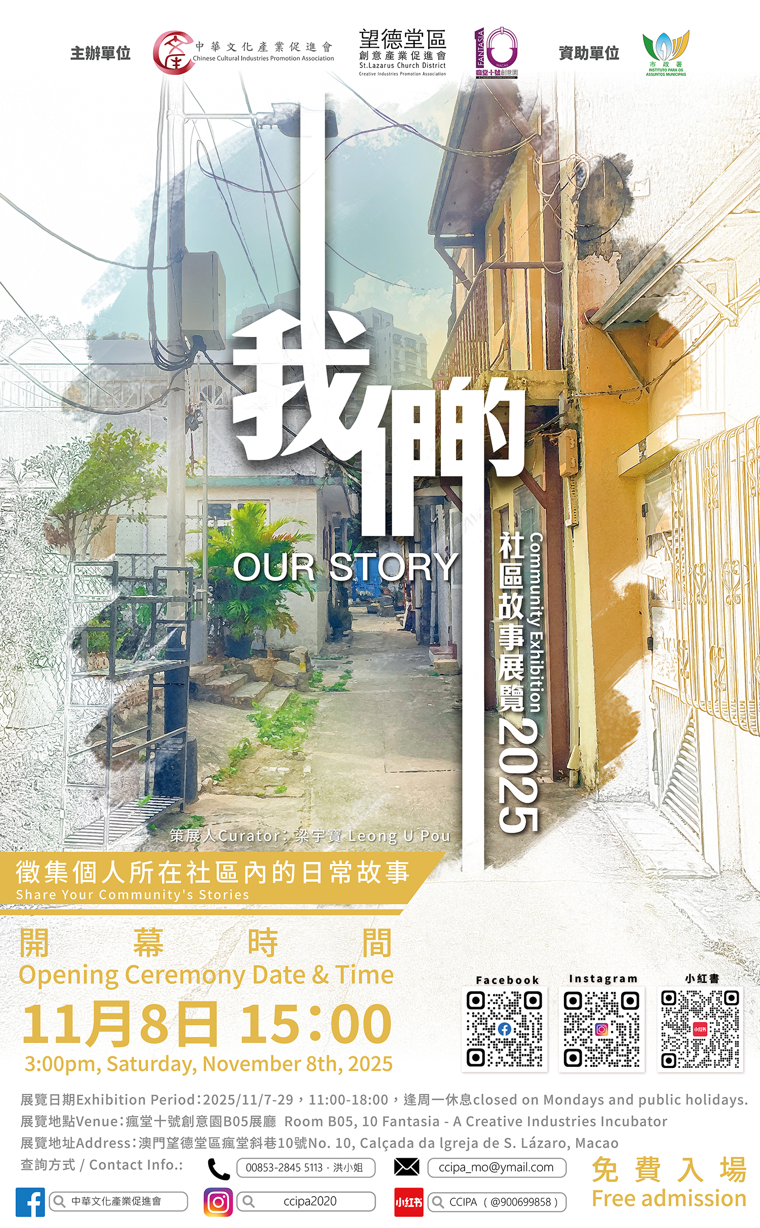 由中華文化產業促進會主辦、望德堂區創意產業促進會、瘋堂十號創意園協辦及澳門特別行政區政府市政署資助的「我們的」社區故事展覽2025將於2025年11月8日(星期六)下午三時正假澳門望德堂區瘋堂斜巷10號─瘋堂十號創意園花園舉行展覽開幕式。