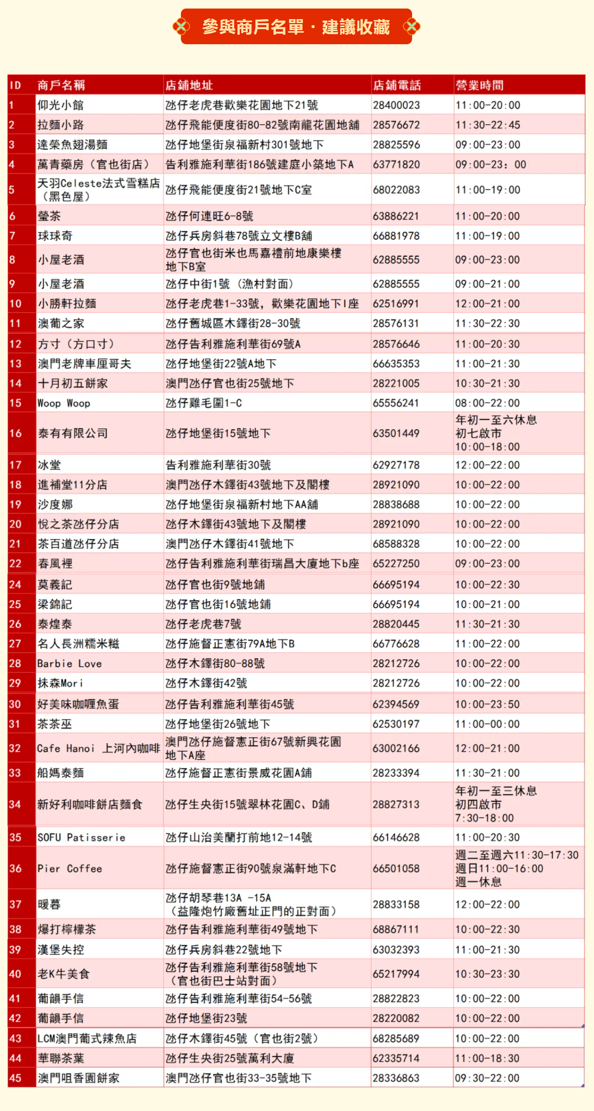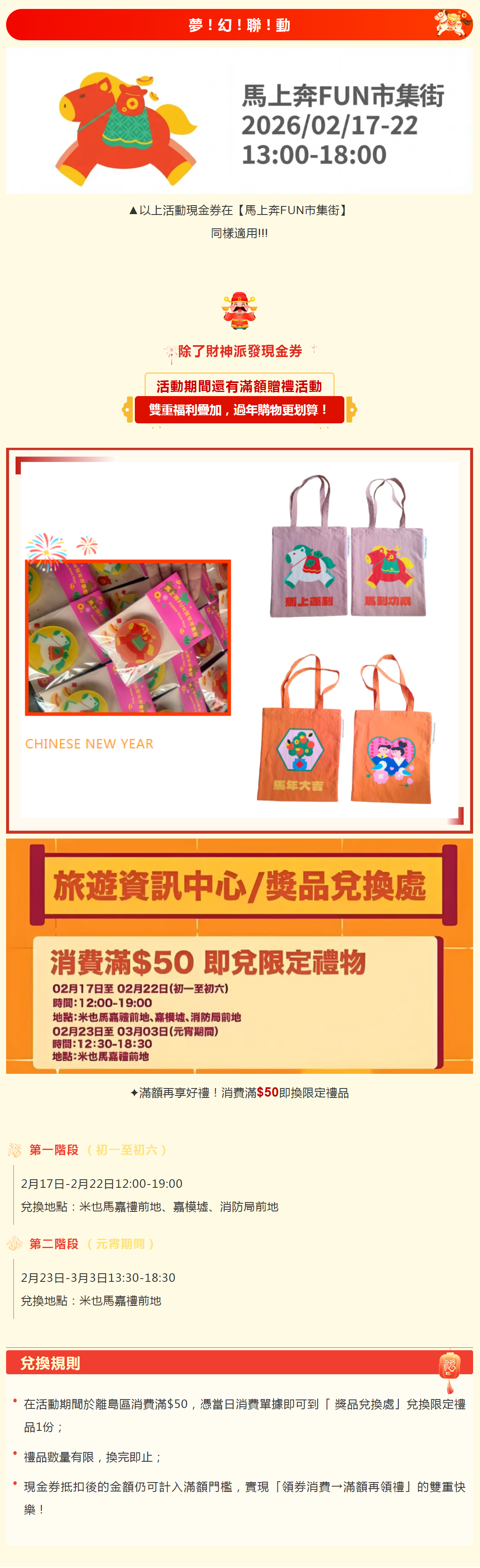 日期 02 月 17 2026 - 02 月 22 2026 初一至初六!氹仔財神巡遊派禮啦 分享這個活動 + Add to Google Calendar + iCal / Outlook export 標籤 免費親子 主辦單位 澳門離島工商業聯合會 電話 63283429 郵箱 info@island.org.mo