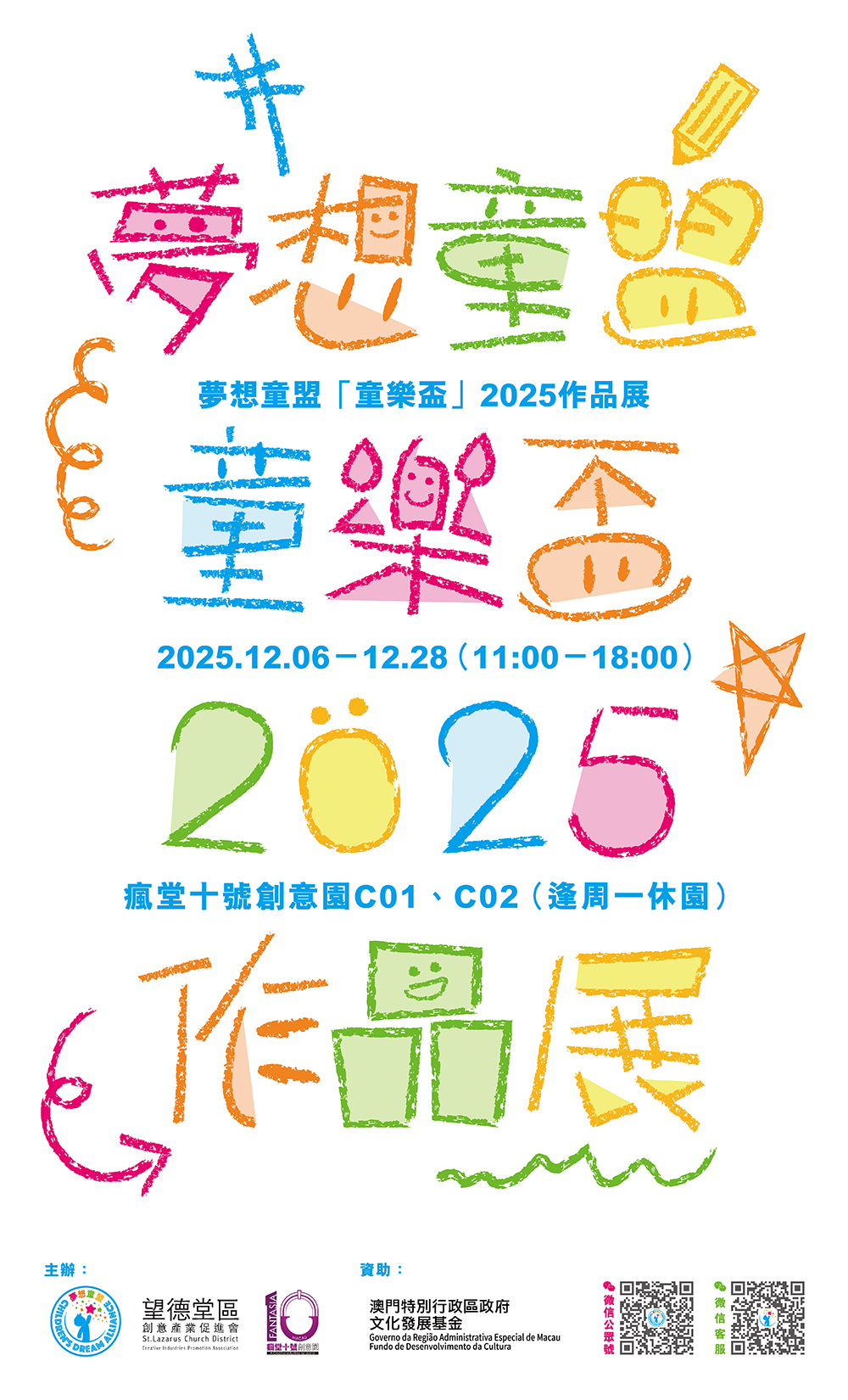 由夢想童盟主辦,望德堂區創意產業促進會、瘋堂十號創意園協辦,並獲澳門特別行政區政府文化發展基金資助的《夢想童盟「童樂盃」2025作品展》將於2025年12月6日(星期六)下午2時30分假澳門望德堂區瘋堂斜巷10號—瘋堂十號創意園花園舉行開幕式。
