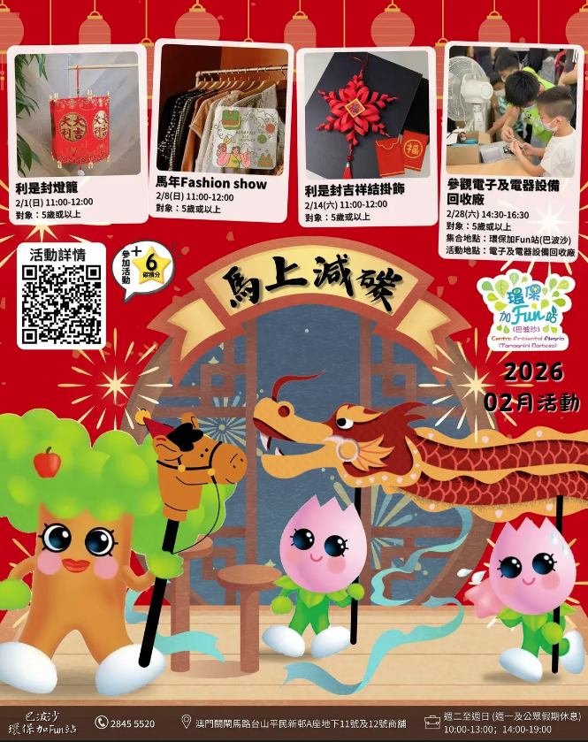 二月,歡迎來到環保加Fun站(巴波沙)參加一系列創意與教育並重的環保工作坊!這些動手實踐的活動專為5歲或以上的家庭及個人設計,讓大家在體驗農曆新年氣氛的同時,學習可持續發展、升級再造及減廢知識。