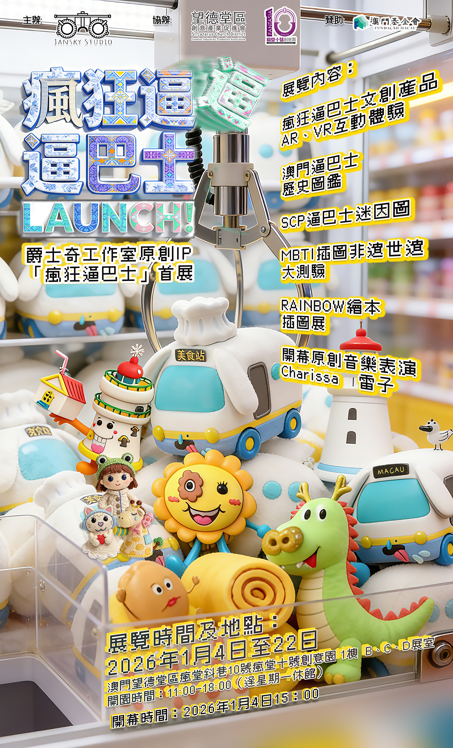 由爵士奇工作室主辨,望德堂區創意產業促進會、瘋堂十號創意園協辦,並獲澳門基金會贊助的爵士奇工作室原創IP「瘋狂逼巴士」首展《瘋狂逼迫巴LAUNCH!》於2026年1月4日(星期日)下午3時正假澳門望德堂區瘋堂斜巷10號—瘋堂十號創意園花園舉行開幕式。開幕式邀請瘋堂十號創意園總監 方惠萍博士,方舟澳門藝術學會會長陳詠璇女士,澳門新媒體藝術協會會長羅曉瑩女士,澳門科技大學人文藝術學院梁潔雯助理教授、澳門37度藝文合作社副主席王嘉誠先生,澳門手作及創意人協會副會長樊笑玲女士及策展人爵士奇工作室創辦人李志豪先生共同擔任主禮嘉賓。