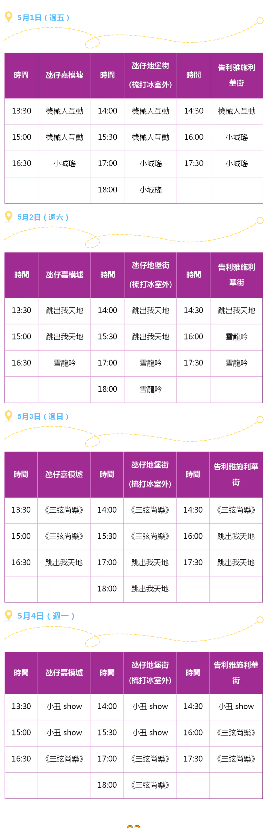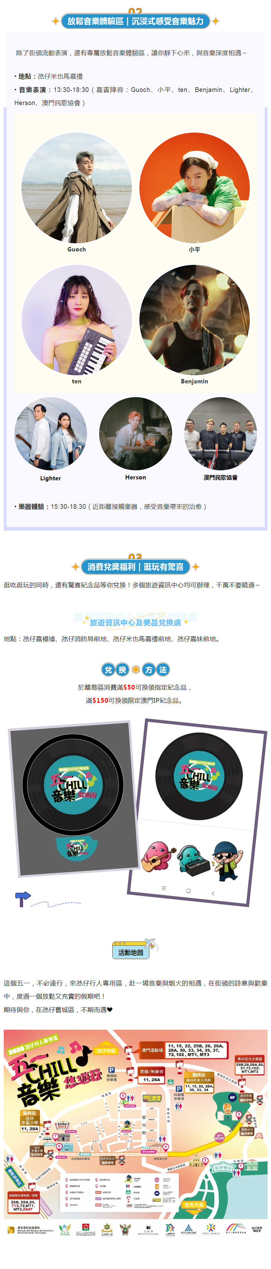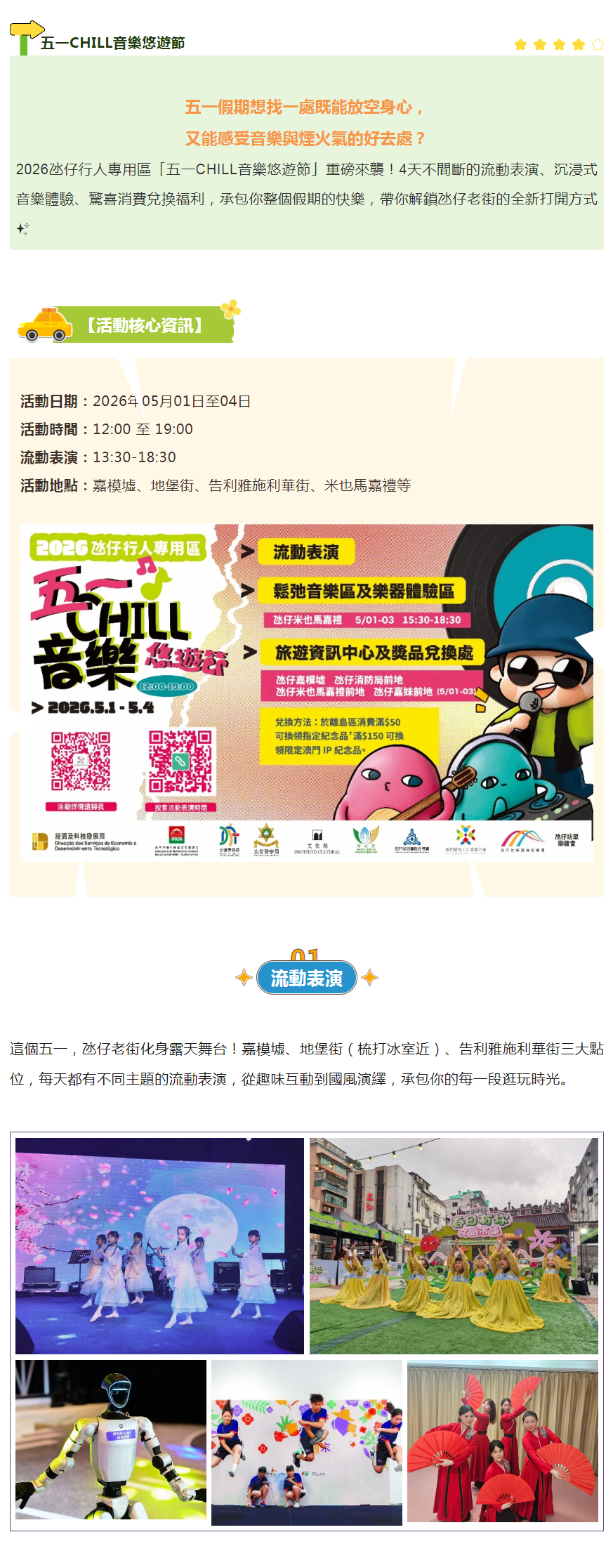 日期 05 月 01 2026 - 05 月 04 2026 時間 12:00 - 19:00 2026氹仔行人專用區|五一CHILL音樂悠遊節,赴一場放鬆感滿分的街頭盛宴 分享這個活動 + Add to Google Calendar + iCal / Outlook export 活動地點 標籤 免費 主辦單位 經濟及科技發展局 電話 (853) 2888 2088 郵箱 info@dsedt.gov.mo Website https://www.dsedt.gov.mo/zh_CN/pg_home 其他單位 澳門市政署 電話 2833 7676 郵箱 depn@iam.gov.mo 網站 http://www.iam.gov.mo 澳門文化局 電話 (853) 8988 4000 郵箱 Info.ddav@icm.gov.mo 網站 http://www.icm.gov.mo 澳門旅遊局 電話 (853) 2831 5566 郵箱 mgto@macaotourism.gov.mo 網站 https://www.macaotourism.gov.mo/zh-hant/