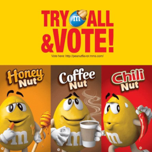 M&M就鼓勵大家嚐嚐他們的新口味,並讓大家投票他們最喜歡的。不僅僅能增加買氣,更能了解用戶的喜好,與顧客互動。