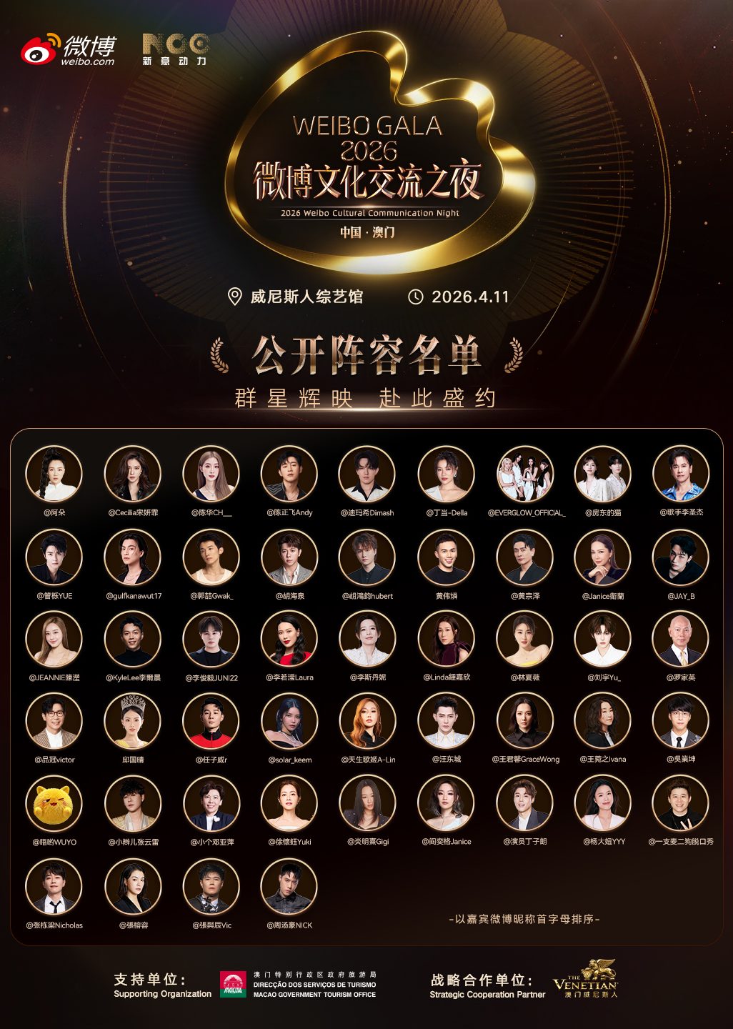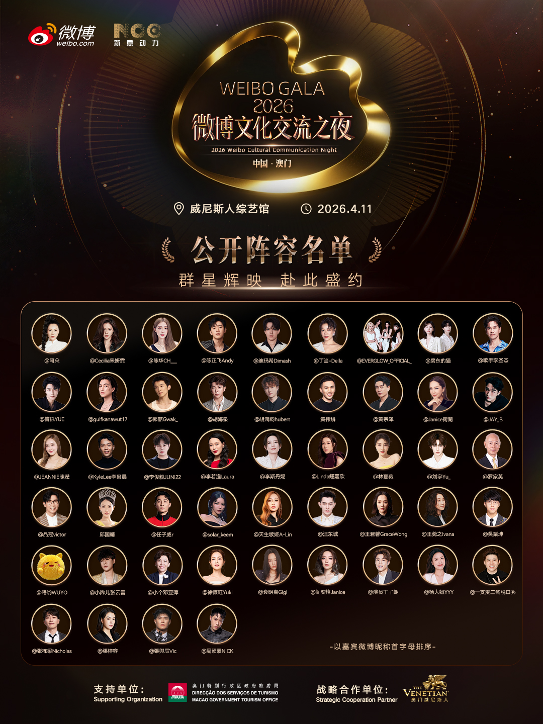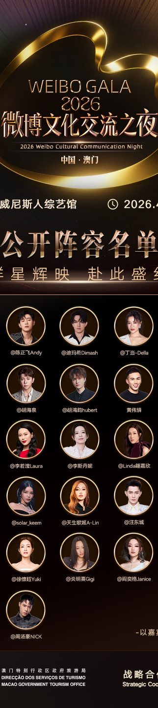 值此澳門回歸27周年之際, “2026微博文化交流之夜-中國·澳門” 將於4月11日在威尼斯人綜藝館榮耀啟幕。本盛典以「金聲匯流年・鎏光共潮生」為主題,採用線上線下聯動形式:線上依託微博主話題及多元子話題,通過實時圖片、視頻與全球網友互動;線下設萬人主會場,呈現明星紅毯、榮耀頒獎、主題表演、粉絲互動及文化市集等環節。本次活動匯聚中國及全球多地影視、音樂、文化領域精英與藝人,發布多元榮譽榜單,以星粉沉浸式深度互動凝聚跨文化溝通的磅礴力量,共促中外文明的交融互鑒、共生共榮。