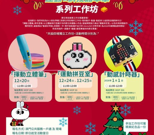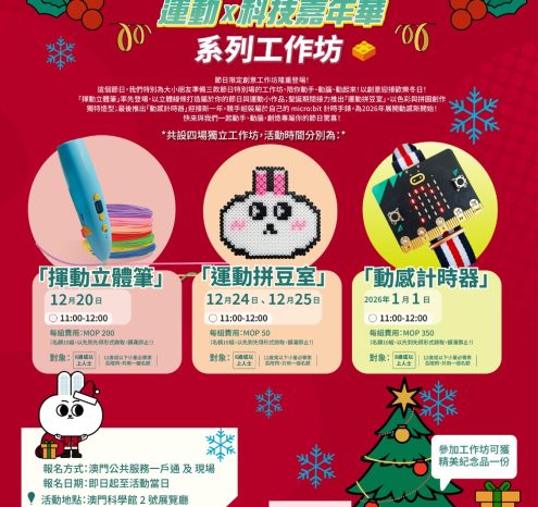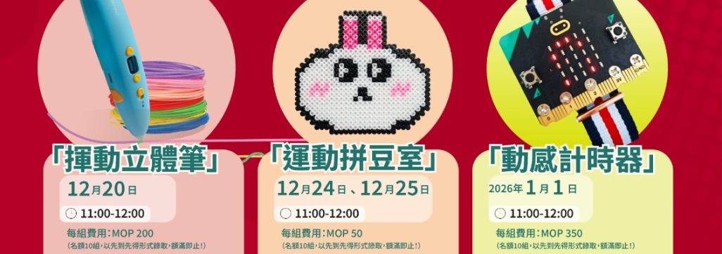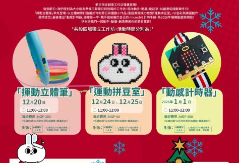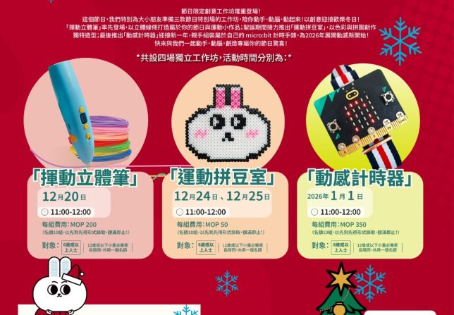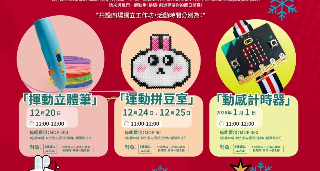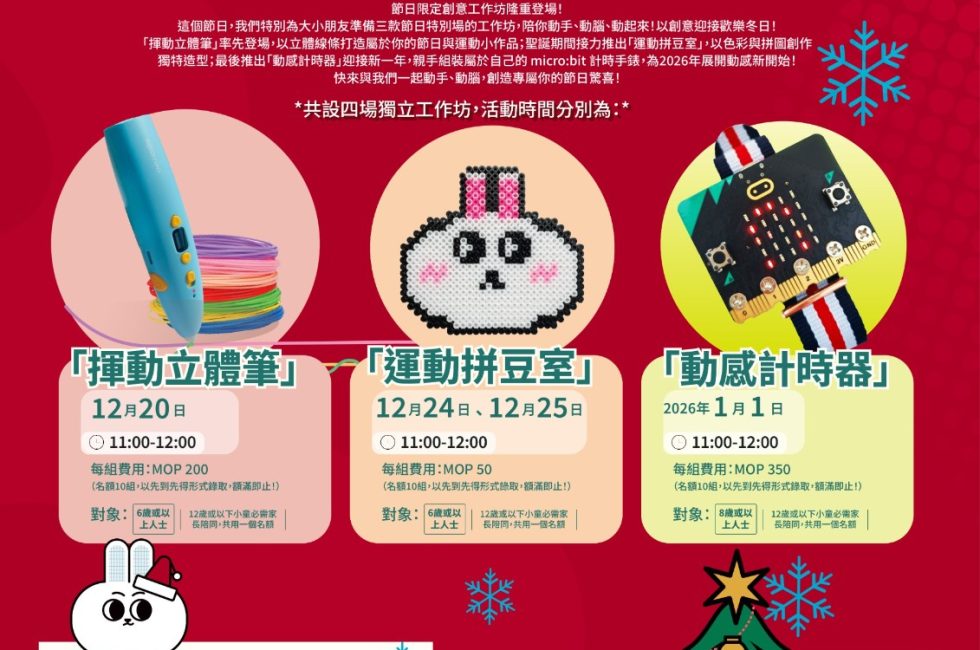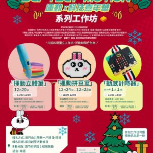 「揮動立體筆」率先登場,以立體線條打造屬於你的節日與運動小作品;聖誕期間接力推出「運動拼豆室」,以色彩與拼圖創作獨特造型;最後推出「動感計時器」迎接新一年,親手組裝屬於自己的 micro:bit 計時手錶,為2026年展開動感新開始!