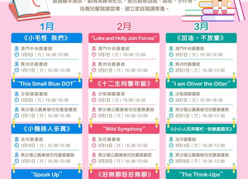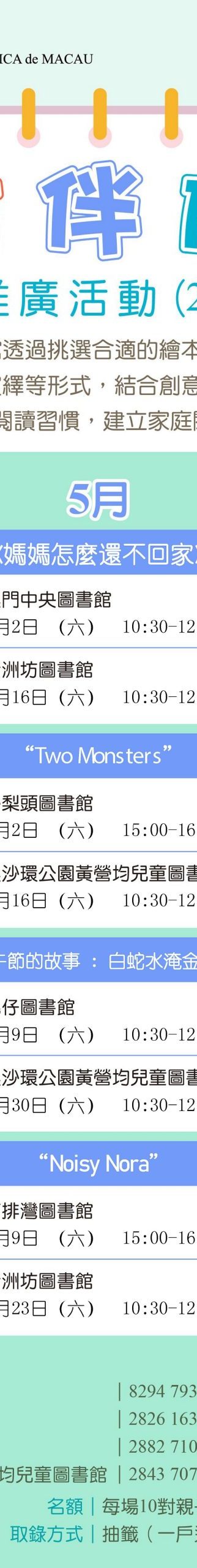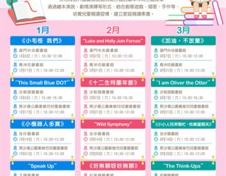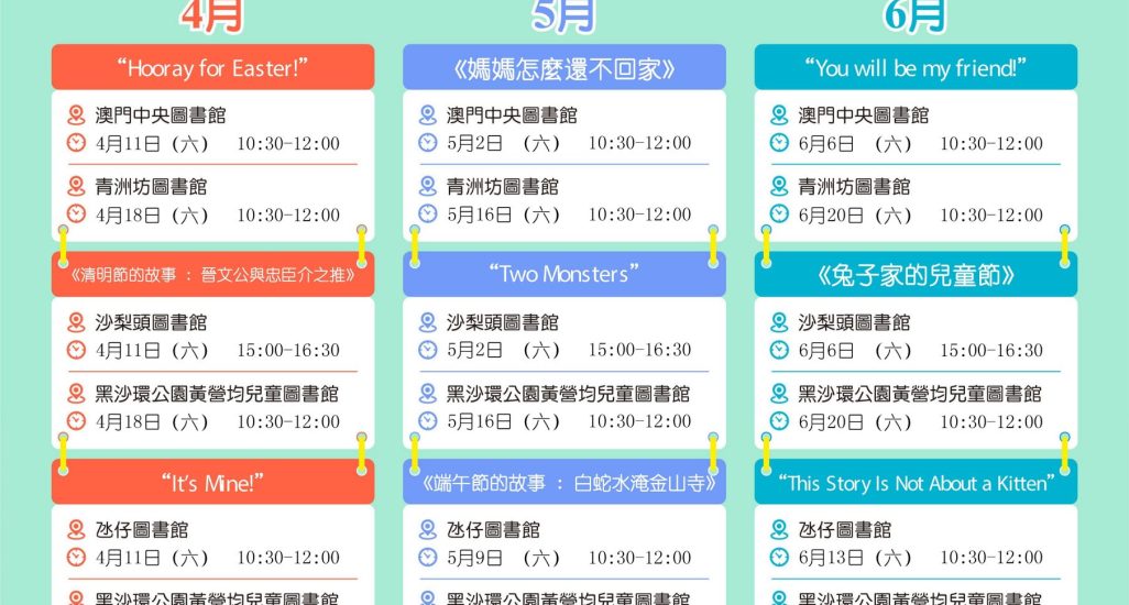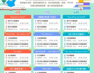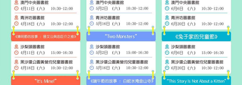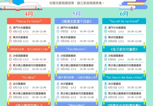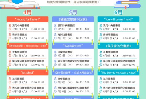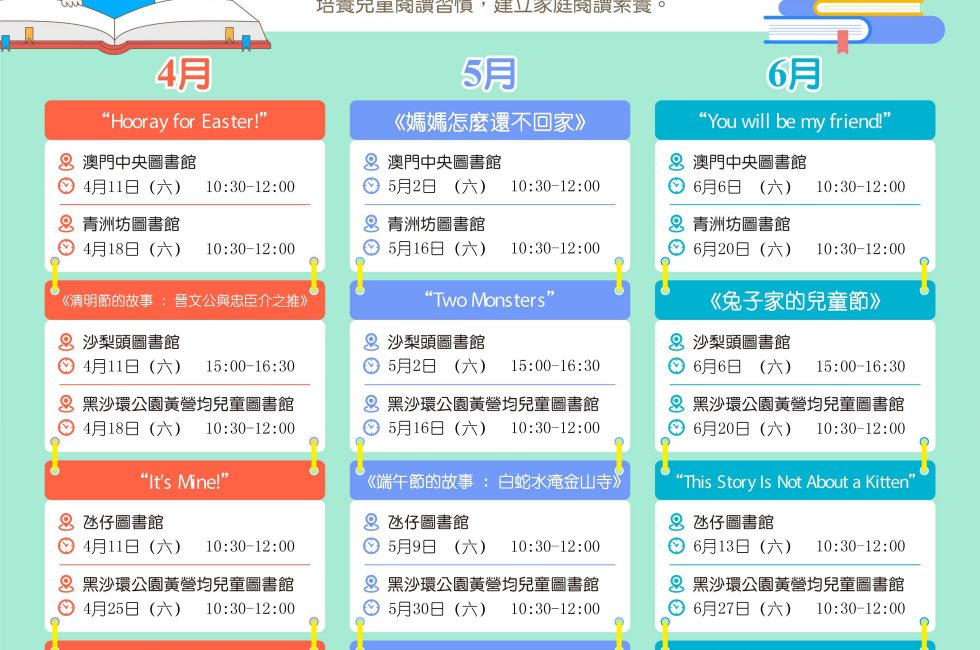 地 點:澳門中央圖書館/沙梨頭圖書館/何東圖書館/下環圖書館/氹仔圖書館/石排灣圖書館/青州坊圖書館/黑沙環公園黃營均兒童圖書館