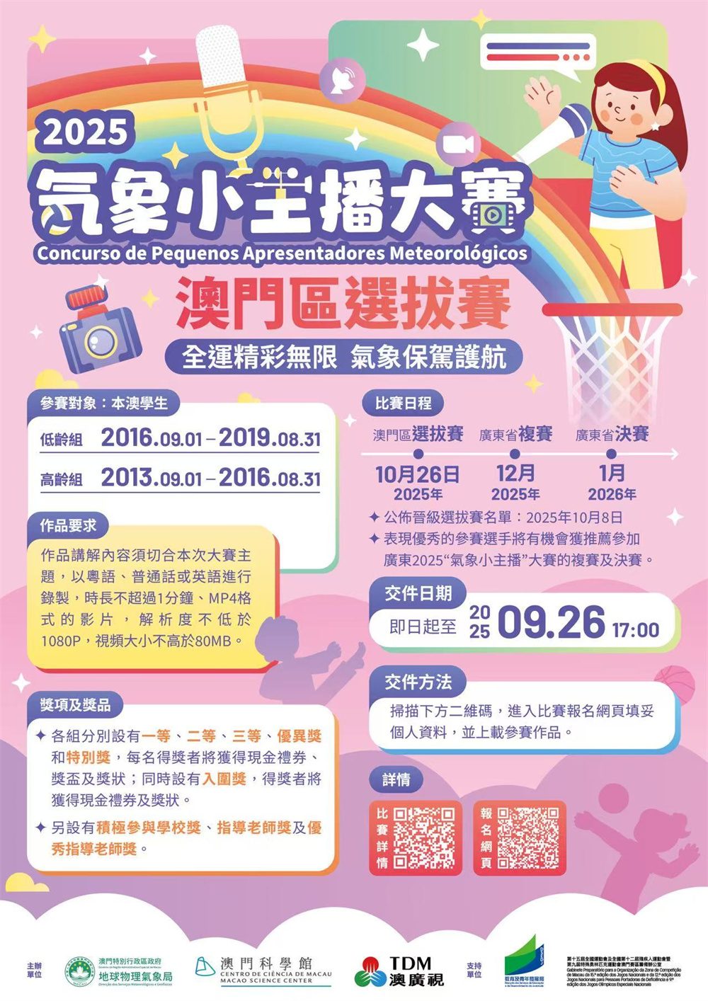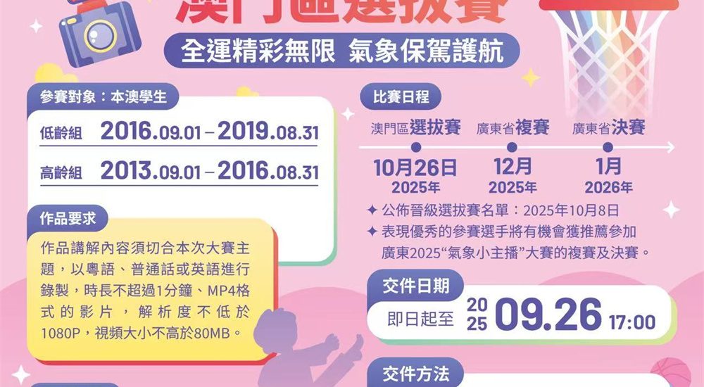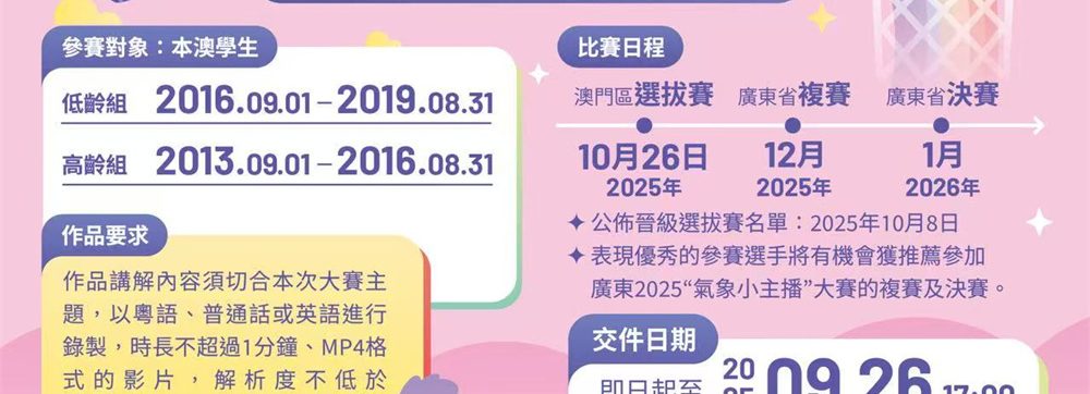 澳門賽程 1. 線上報名及提交視頻作品:即日起至2025年9月26日下午5時 2. 公佈晉級選拔賽名單及指定講解主題:2025年10月8日 3. 賽前研學團:2025年10月18日 4. 選拔賽及頒獎典禮:2025年10月26日 廣東賽程(表現優秀的參賽選手,將有機會獲推薦參加廣東2025“氣象小主播”大賽的複賽及決賽) 5. 賽前特訓:2025年11月 6. 複賽:2025年12月 7. 決賽:2026年1月比賽要求: